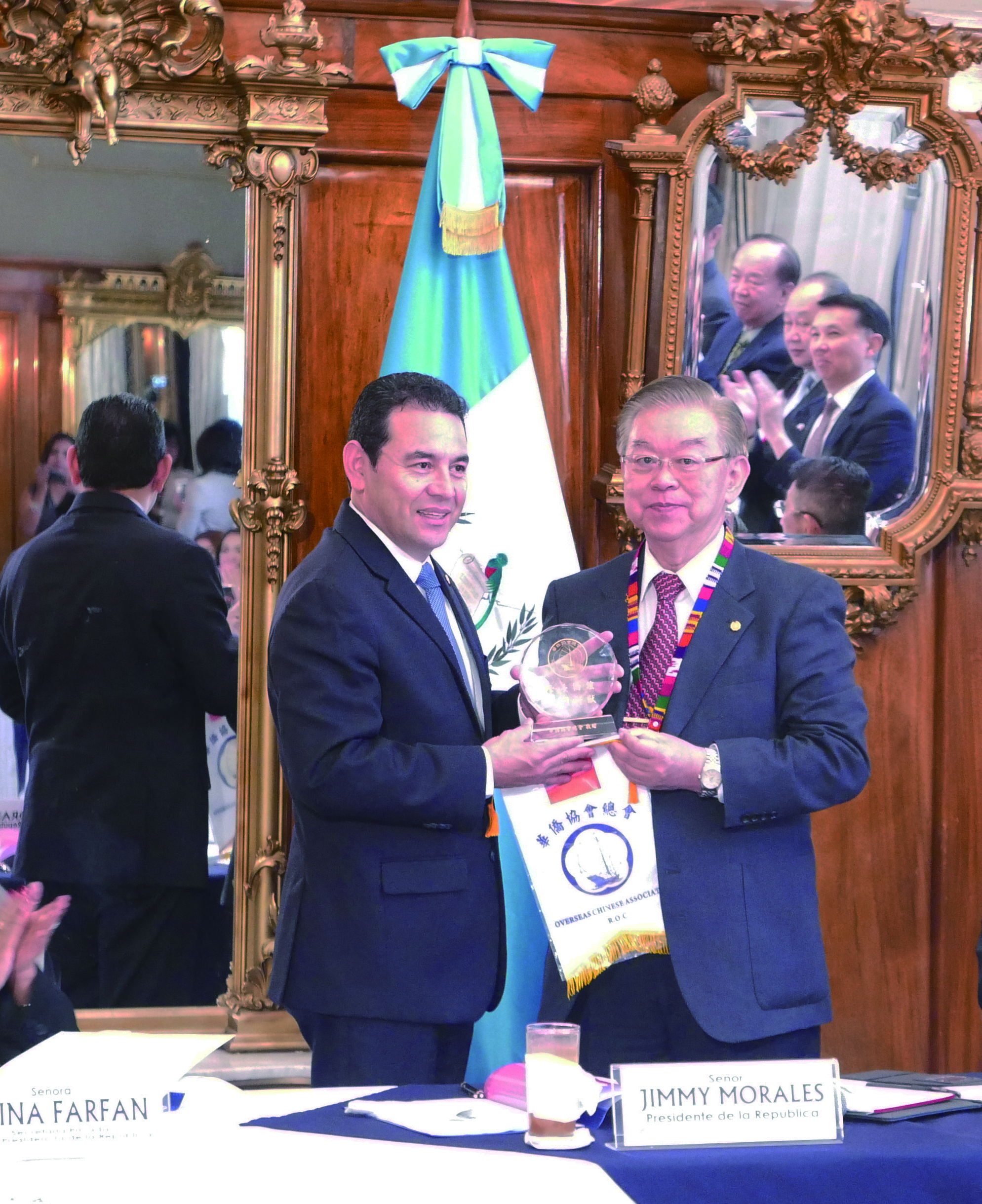 瓜地馬拉總統莫拉雷斯(Jimmy Morales)接受海龍說明,代表本會及華僑贈送錦旗和禮品後,特別簽名致贈海龍瓜地馬拉歷史圖書一册,數次握手,以示感謝及親切投緣。因屬總統特殊禮遇,賴建中大使讚譽本會對促進外交的協助。實為此行值得一書的榮耀。