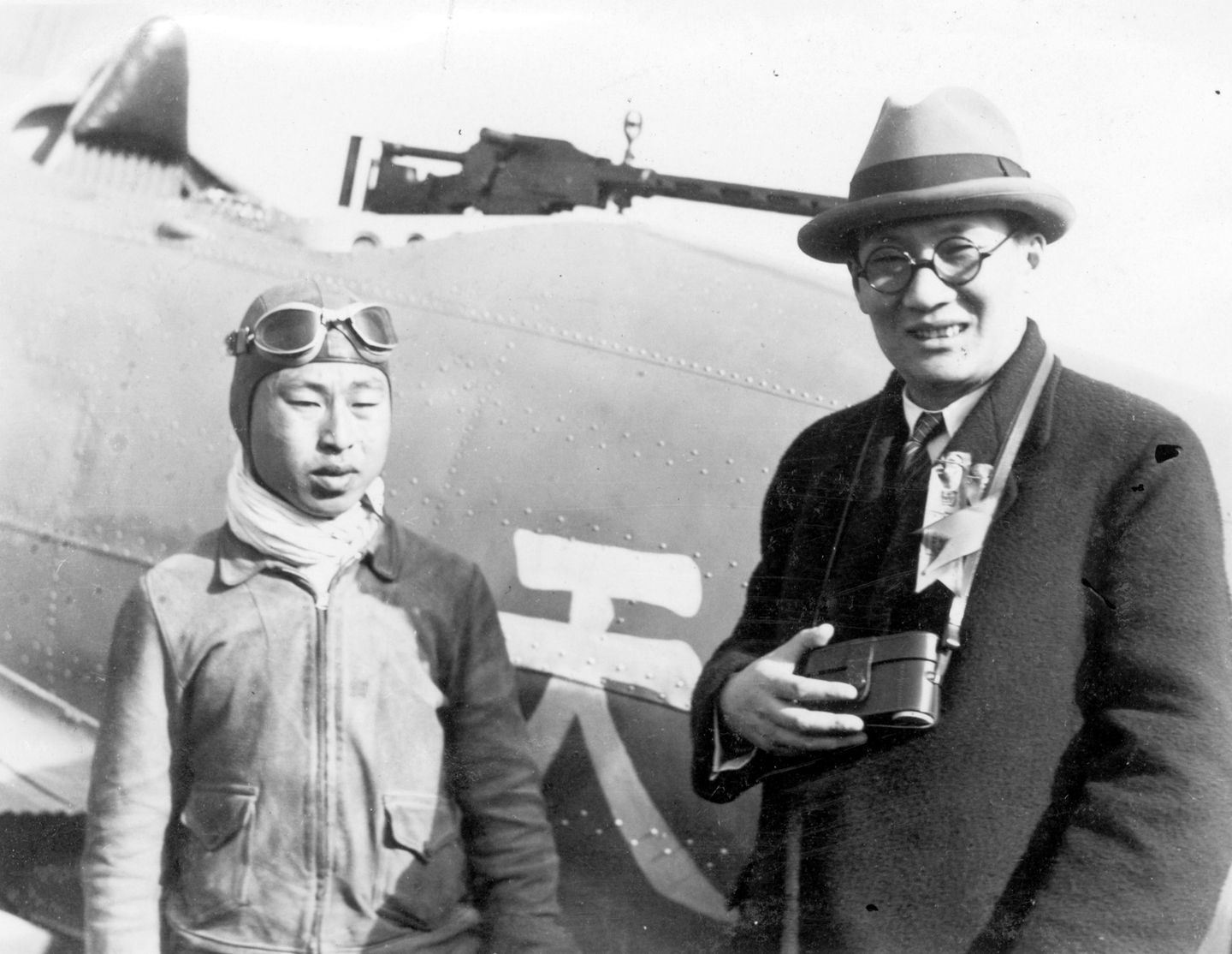 民國 二十三年三月十八日航空署驅逐隊隊長高志航(左)駕機表演後與吳鐵城(右)市長合影。