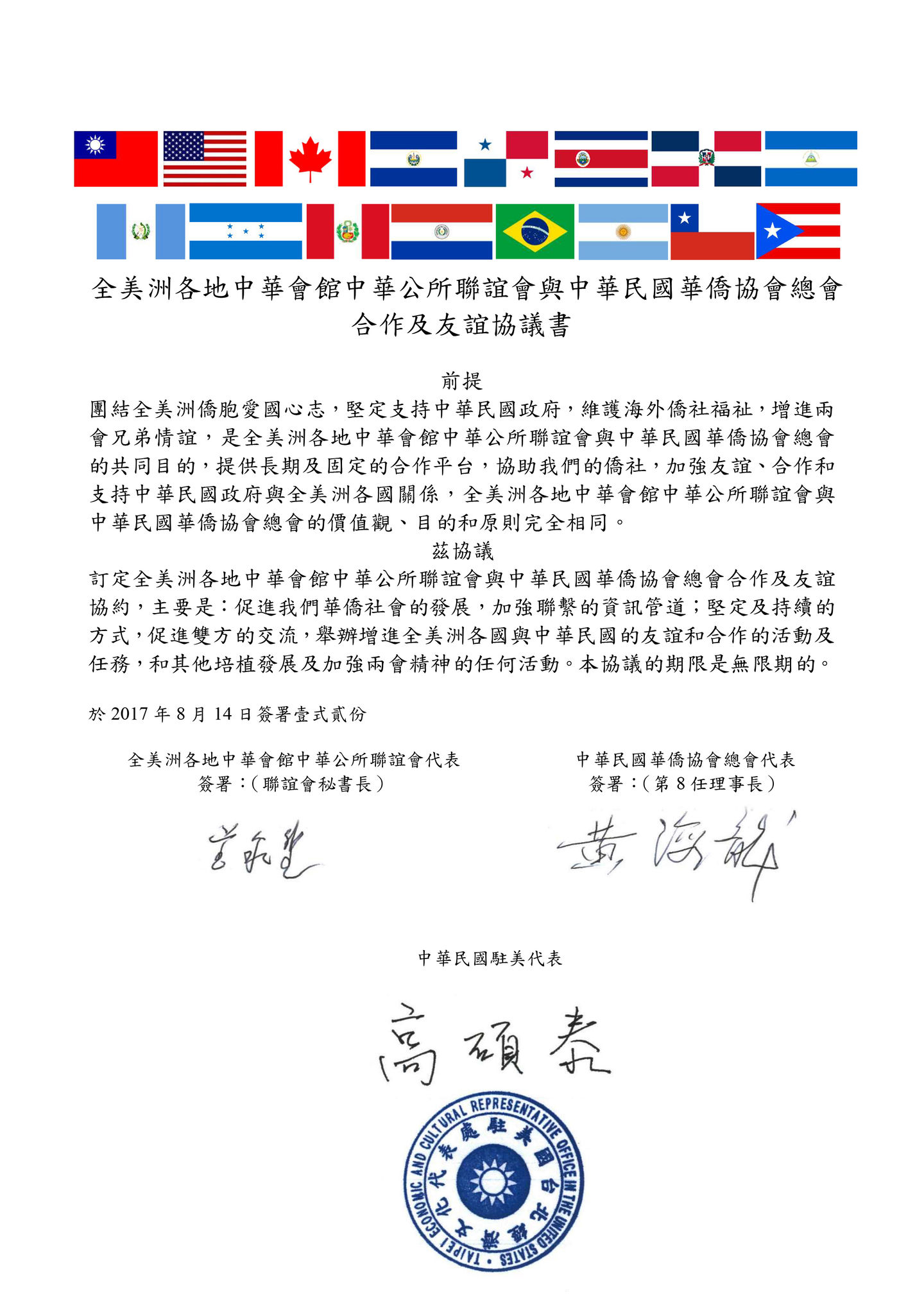 美洲各地中華會館/公所聯誼會與本會簽署合作及友誼協議書