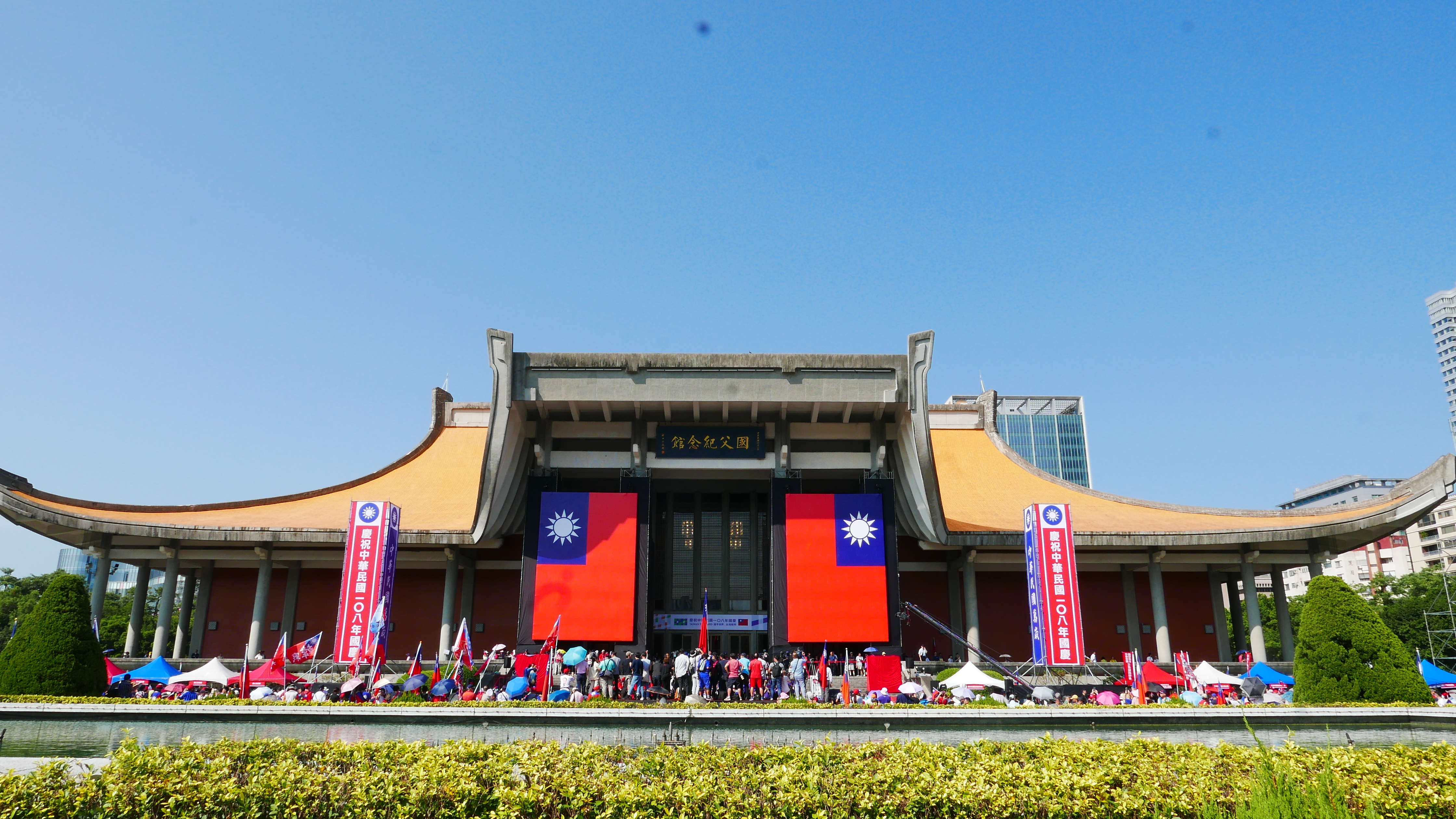 國父紀念館萬頭鑽動,中華民國青天白日滿地紅的國旗,旗海飄揚,兩幅巨型國旗懸掛於國父紀念館正門,配上斗大的藍底反白「中華民國萬歲」布幅,氣勢恢宏,展現了中華民國歡慶108歲生日的喜悅。