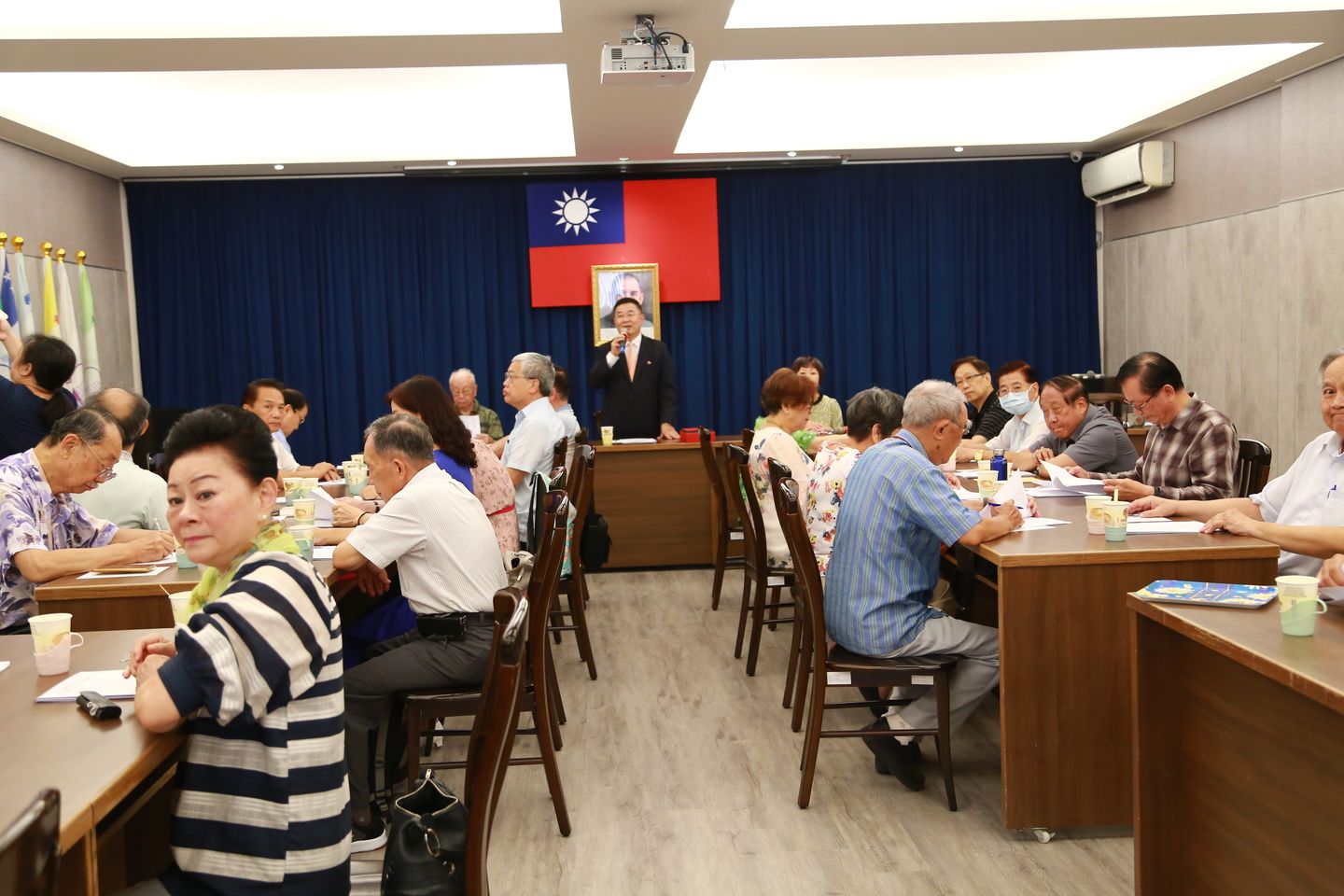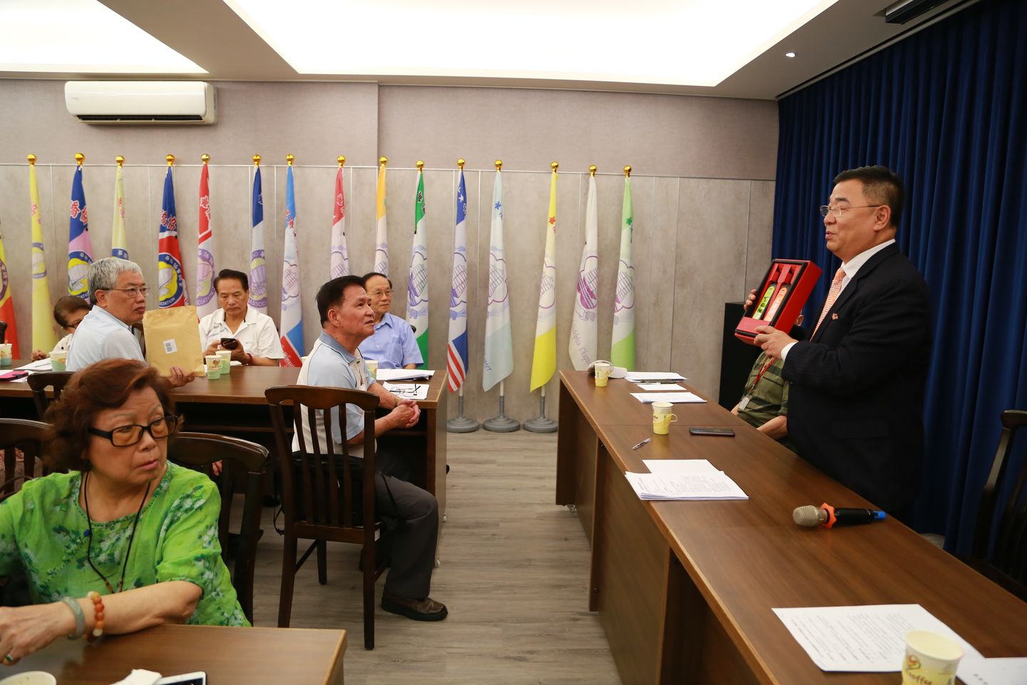 國父銅像由圖書室移至會議室正中位置,加裝底座,鑴刻國父墨寶,以示尊崇。海外29個分會會旗亦自樓梯間移至會議室,爾後分會會長來訪時,見到自己分會會旗擺置於會議室,一定會感到很高興,因為他們感受到總會對海外分會的重視。