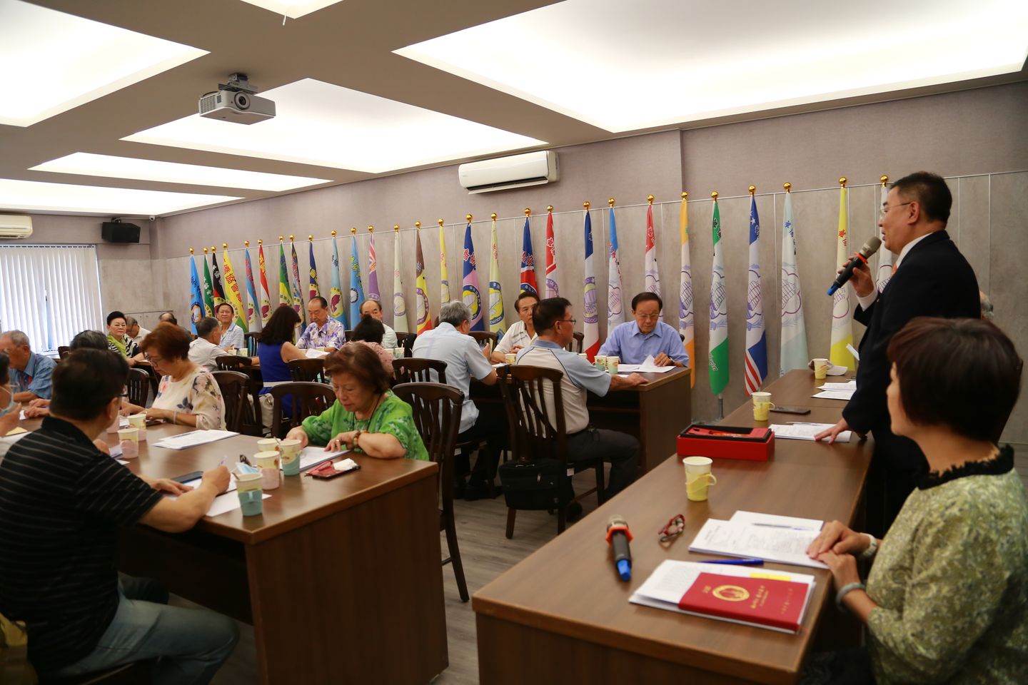 今天是理事會首次於新整修完成的會議室召開會議。現在的會議室較未整修前寬敞,主要將以前的理事長室與會議室打通,因為理事長室不需要那麼大的空間。現在,理事長室移至以前秘書長室,秘書長室移至對面房間。以前召開理事會時,顯得擁擠,召開理監事聯席會議時,座位不足等現象,都解決了。