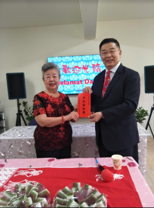 林齊國理事長祝賀印尼歸僑協會會館整修完成,煥然一新,象徵會務蒸蒸日上,同時致贈該會中秋節清寒歸僑慰助金。