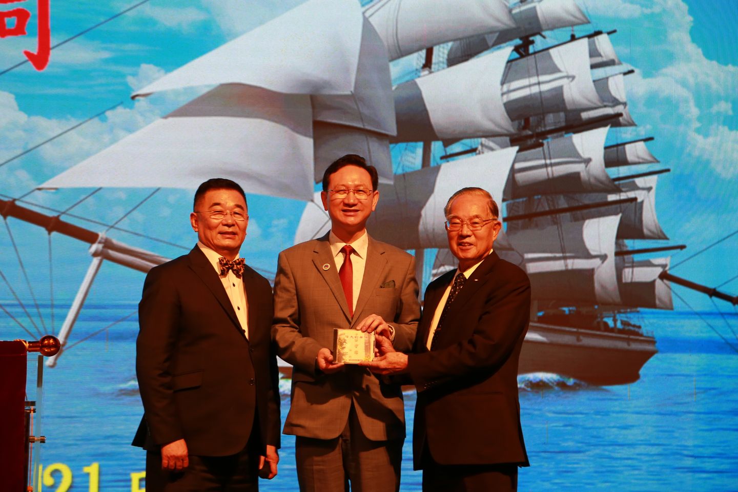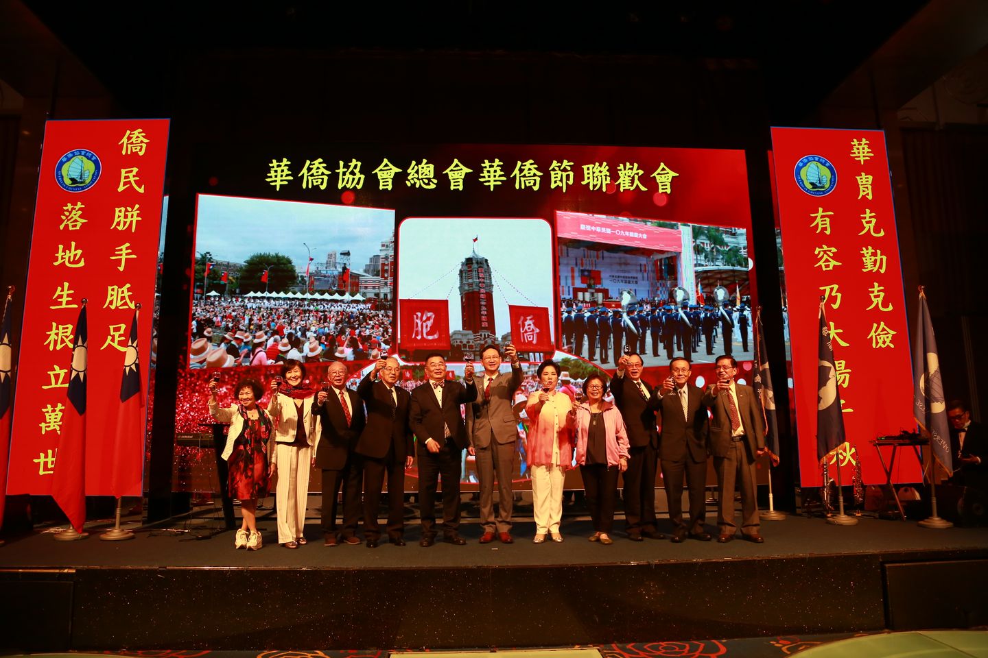 慶祝大會播映林理事長講述華僑節由來的短片,生動有趣,讓與會者印象深刻。致詞時,高舉伍世文理事長任內製作的「偉大的華僑」CD,交由伍前理事長轉贈童委員長。