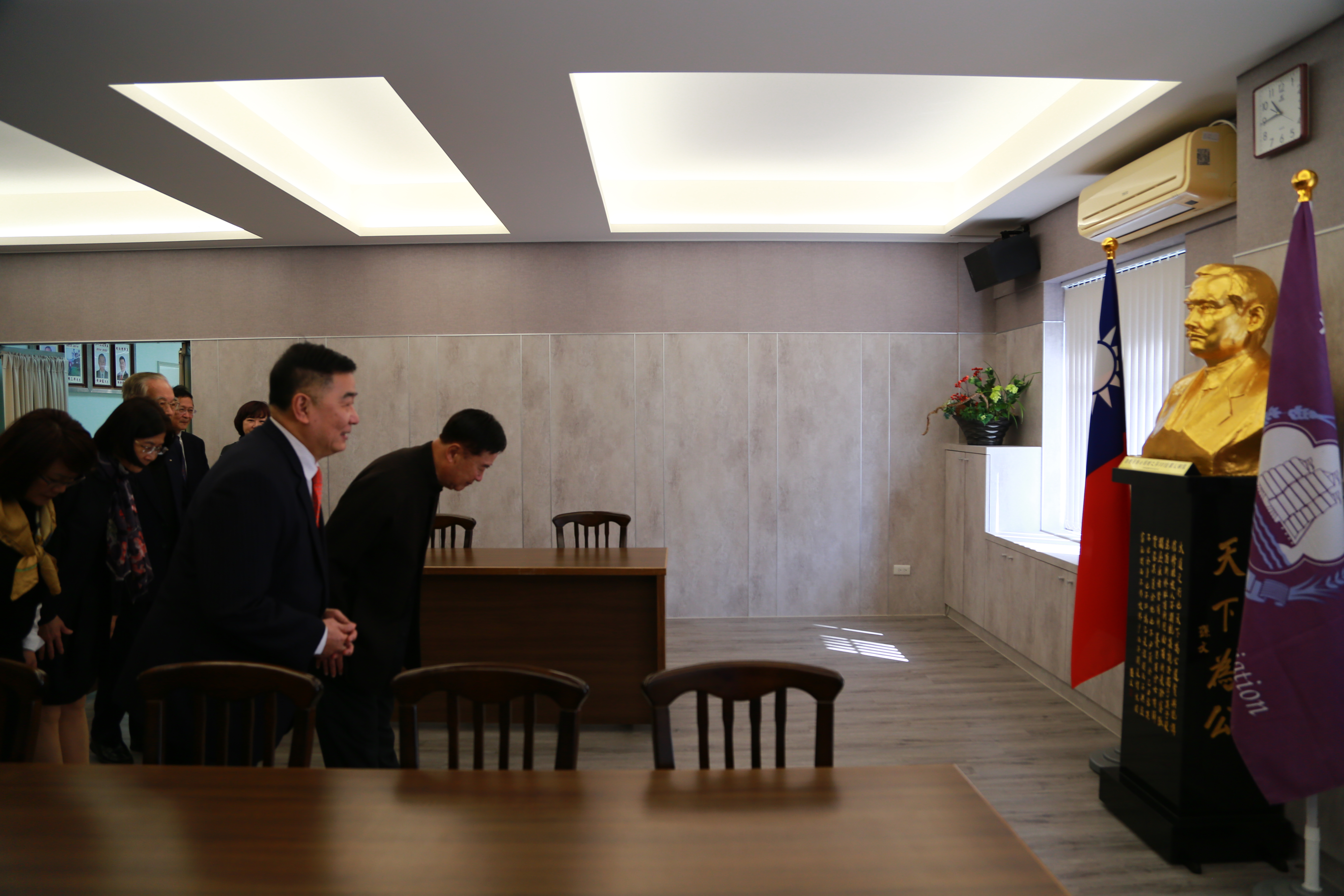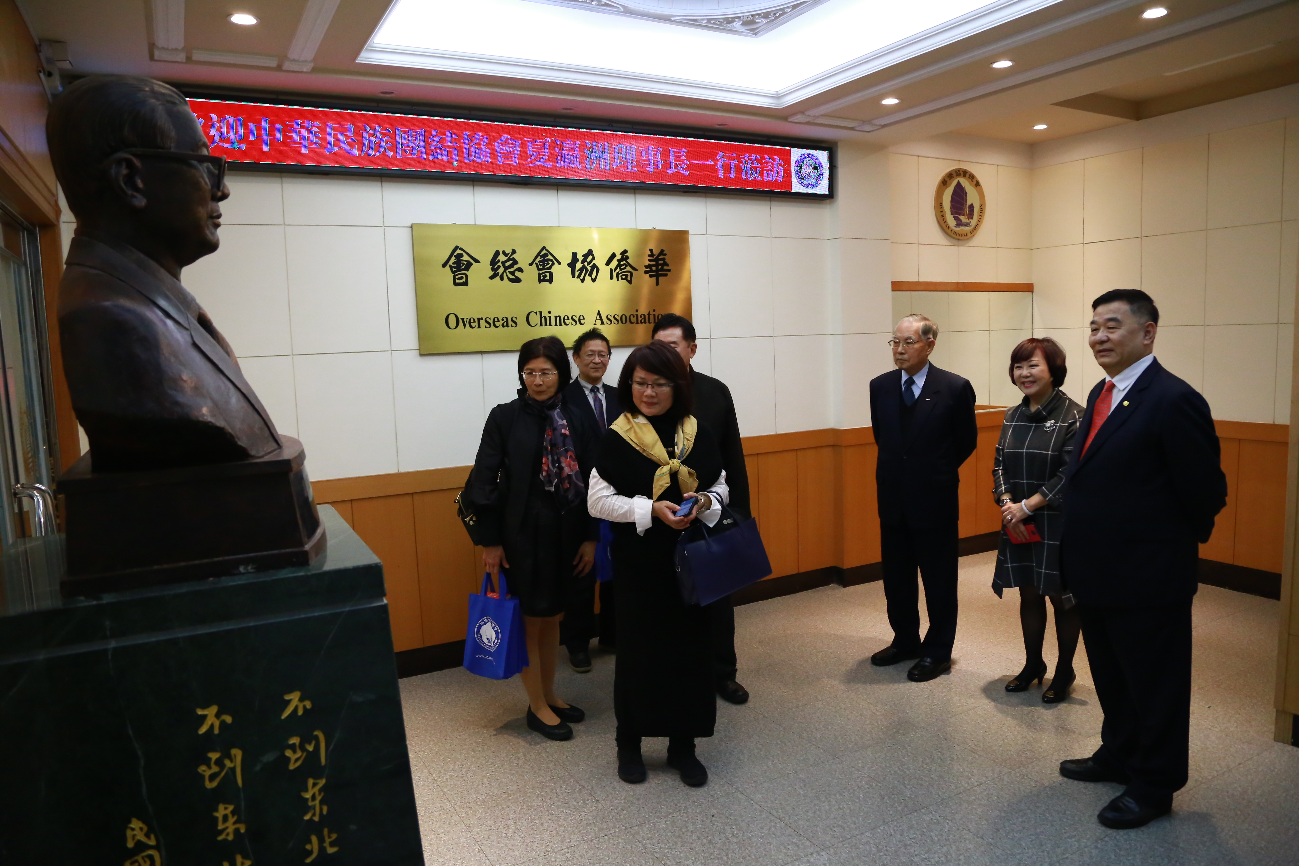 參觀本會鐵城堂會議室時,向國父銅像致最敬禮,並與國父銅像合影。對於本會圖書室藏書及每兩個月出版的僑協雜誌,訪客咸讚不絕口。