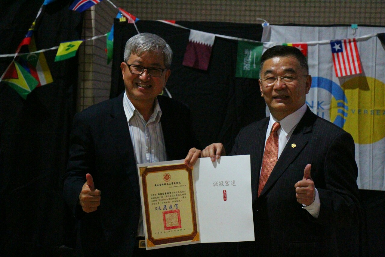 吳連賞校長致贈林理事長感謝狀,感謝本會長期支持贊助該校僑生活動。