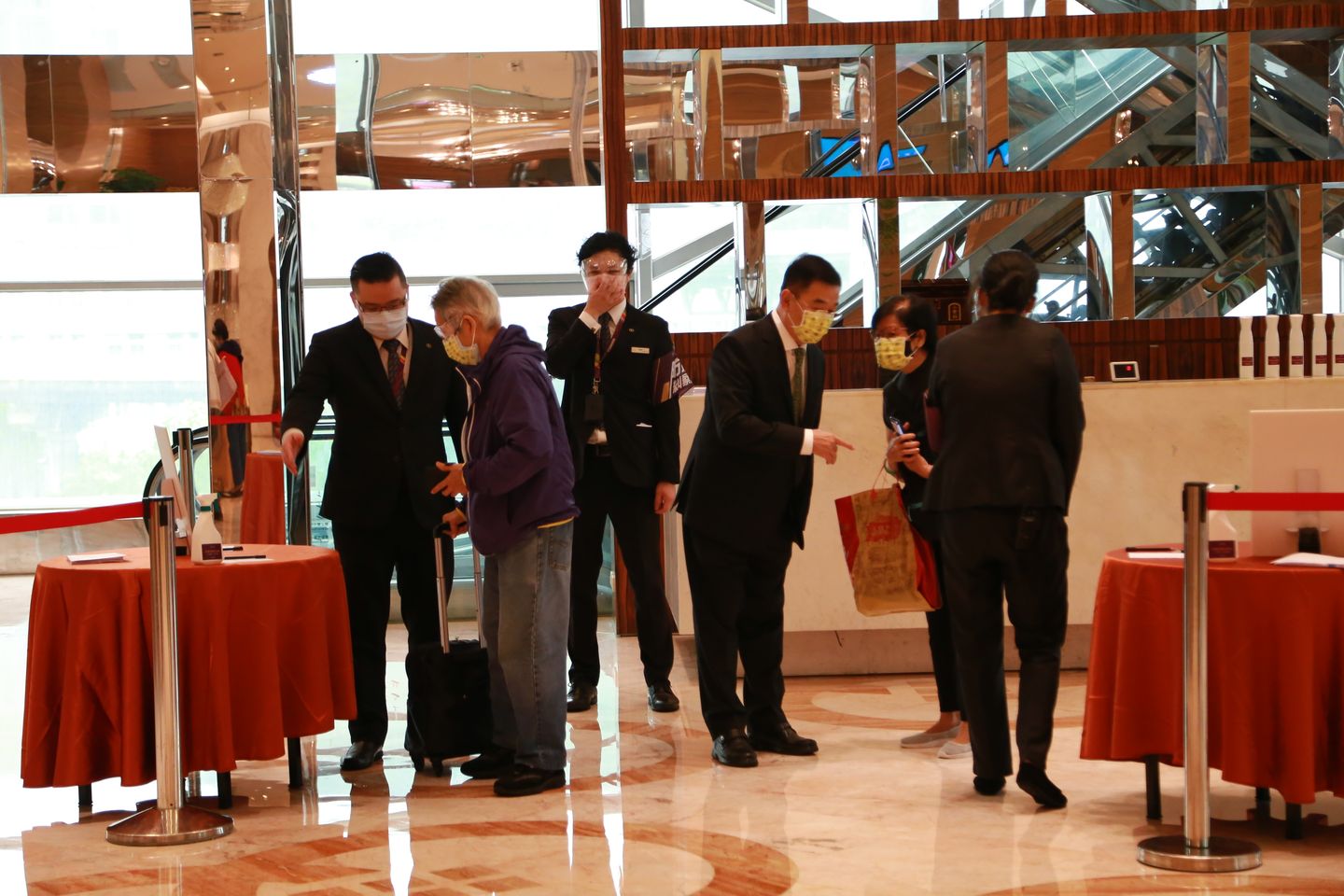 典華的防疫作業滴水不漏,第一關是在一樓大廳正門口,第二關則是在三樓聯歡會現場入口。典華防疫糾察隊依據衛福部規定,對進場會員逐一採行掃瞄QRcode實聯制、量額溫、雙手噴酒精,戴口罩那是一定要的啦。