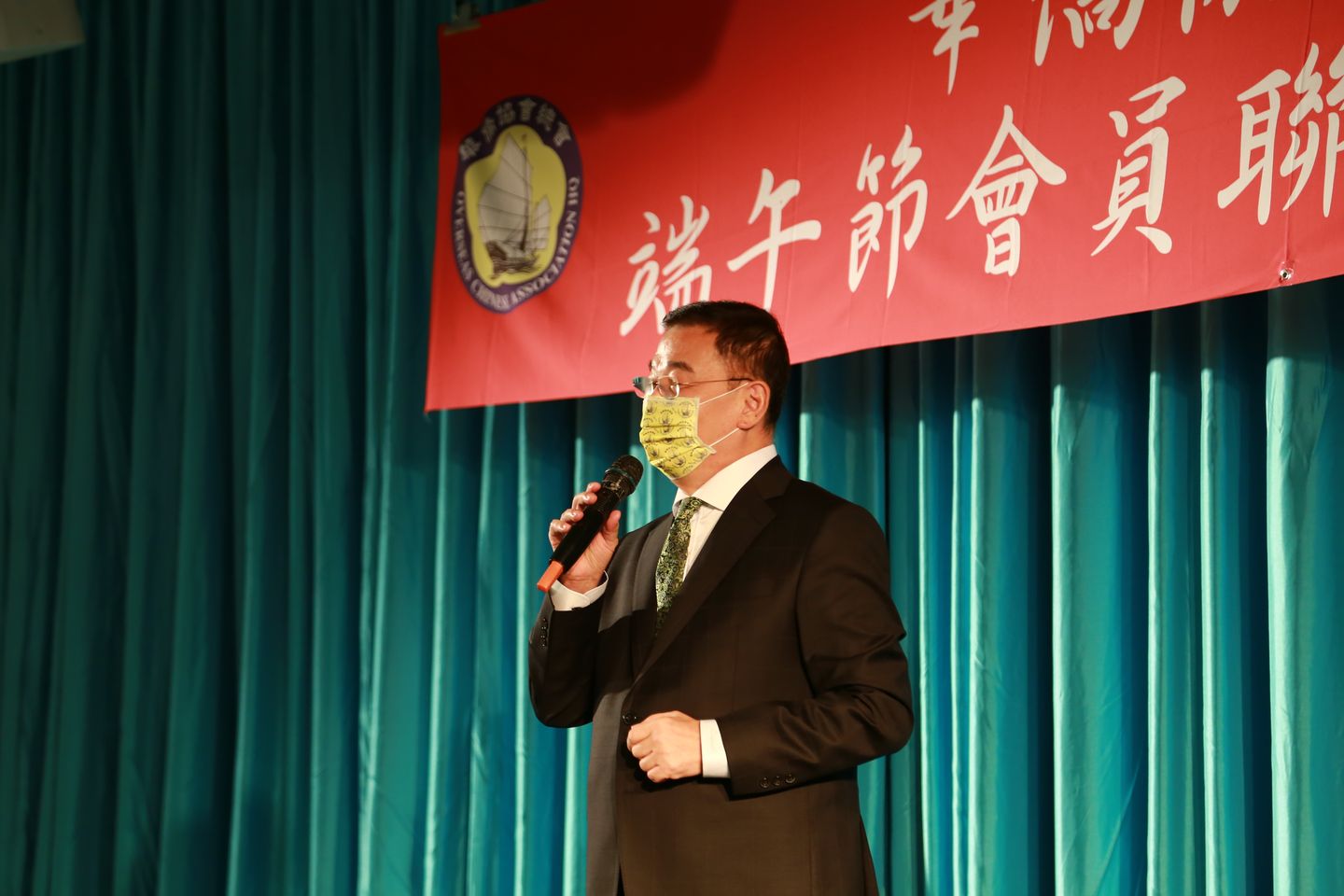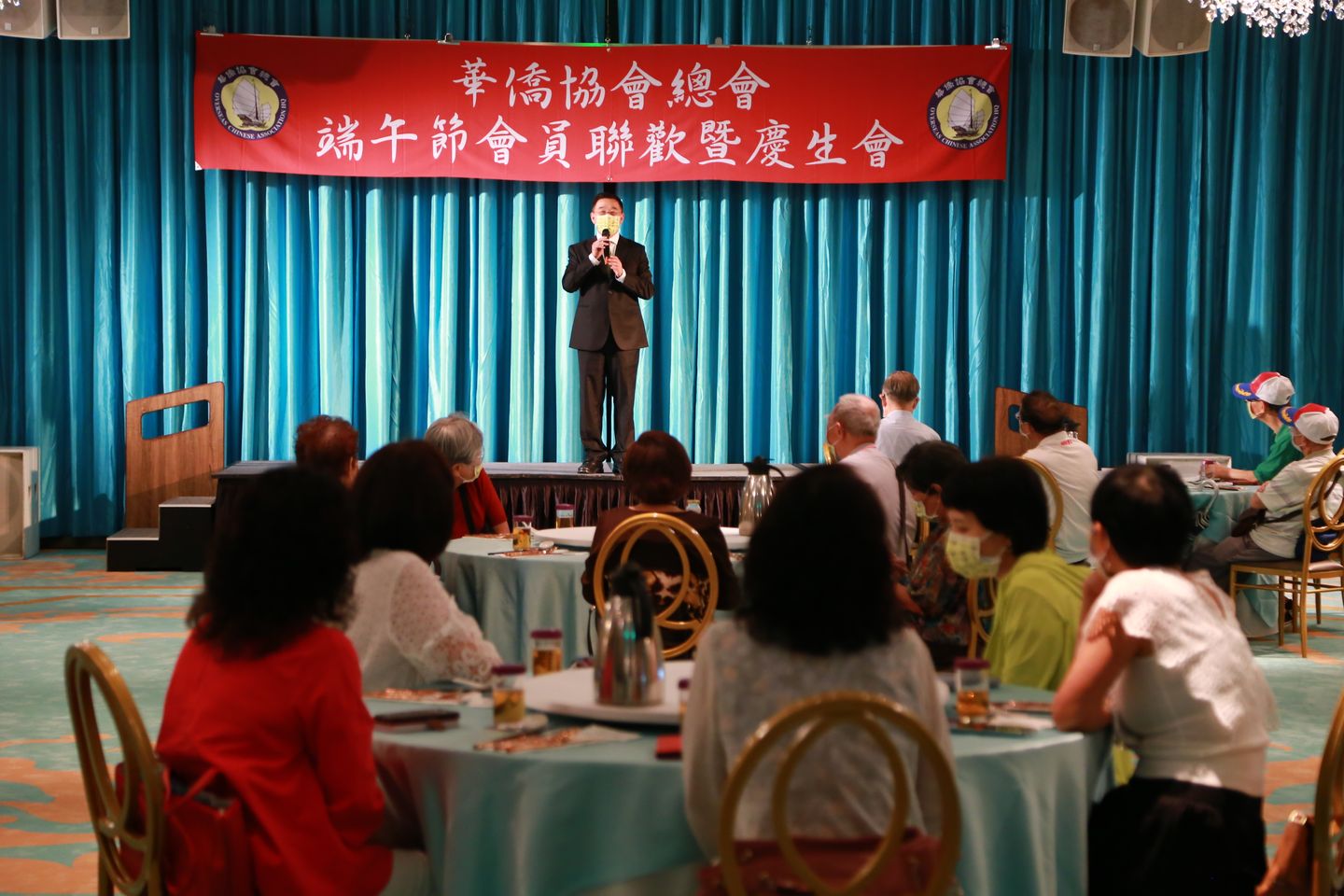林齊國說,很高興今天和大家會面,新冠疫情把大家的生活節奏都打亂了,端午節會員聯歡暨慶生會從六月延至八月,整整延後兩個月,再過一個月就是中秋節了。我們今天的聯歡會完全依照衛福部指示的「每廳五十人、梅花座、個人套餐」規定辦理,確保大家健康平安。今天剛好是立秋,明天是父親節,祝福大家佳節快樂,闔家安康。