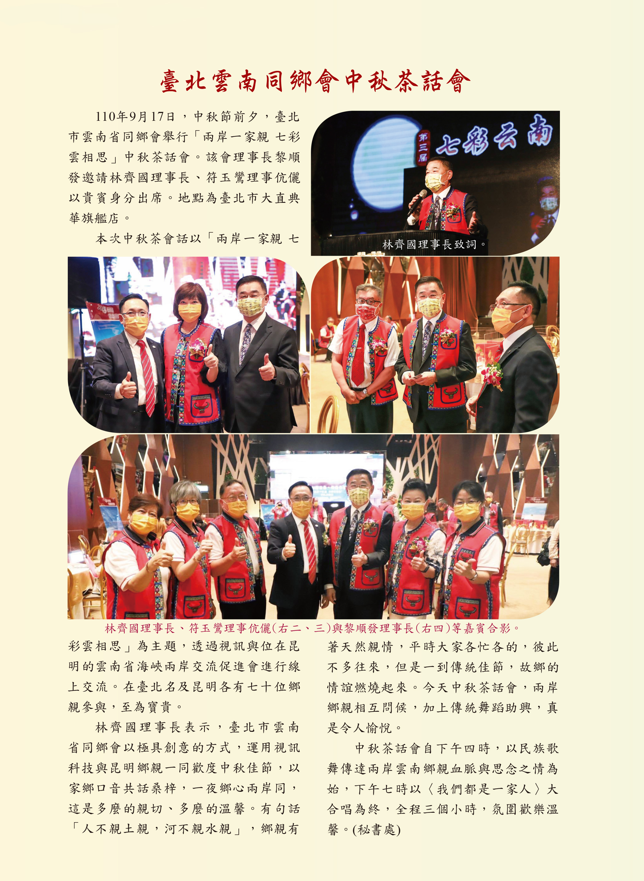 110年9月17日,中秋節前夕,臺北市雲南省同鄉會舉行「兩岸一家親 七彩雲相思」中秋茶話會,該會理事長黎順發邀請林齊國理事長以貴賓身分出席。地點為臺北市大直典華旗艦店。