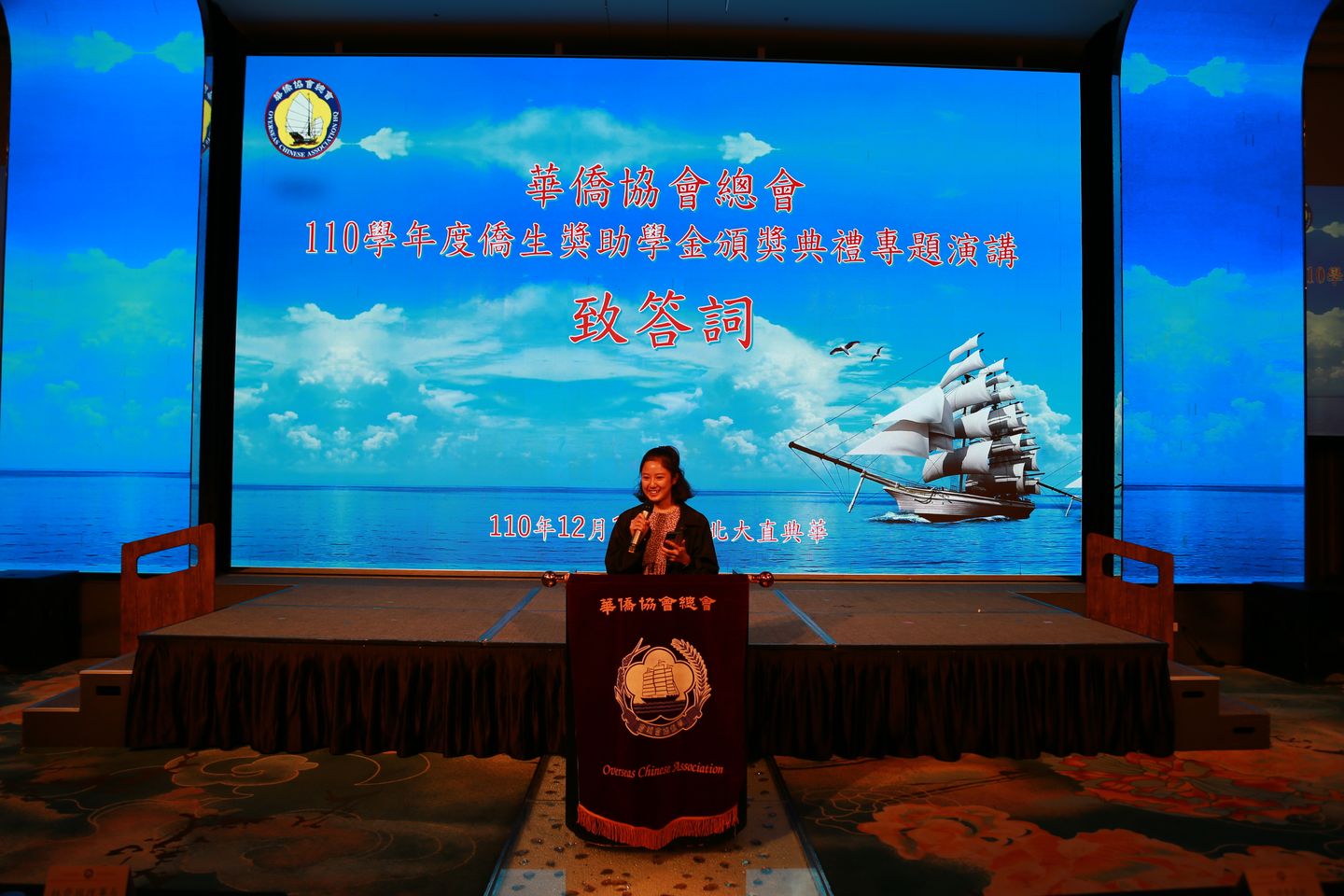 政治大學楊樂悠同學代表僑生致謝詞,她感謝華僑協會總會頒發的獎學金減輕僑生家庭的負擔也給予僑生在經濟上的實質幫助。今天聆聽林理事長的專題演講體會到了學習產生智慧智慧優化生活讓我們大家一起來終生學習。