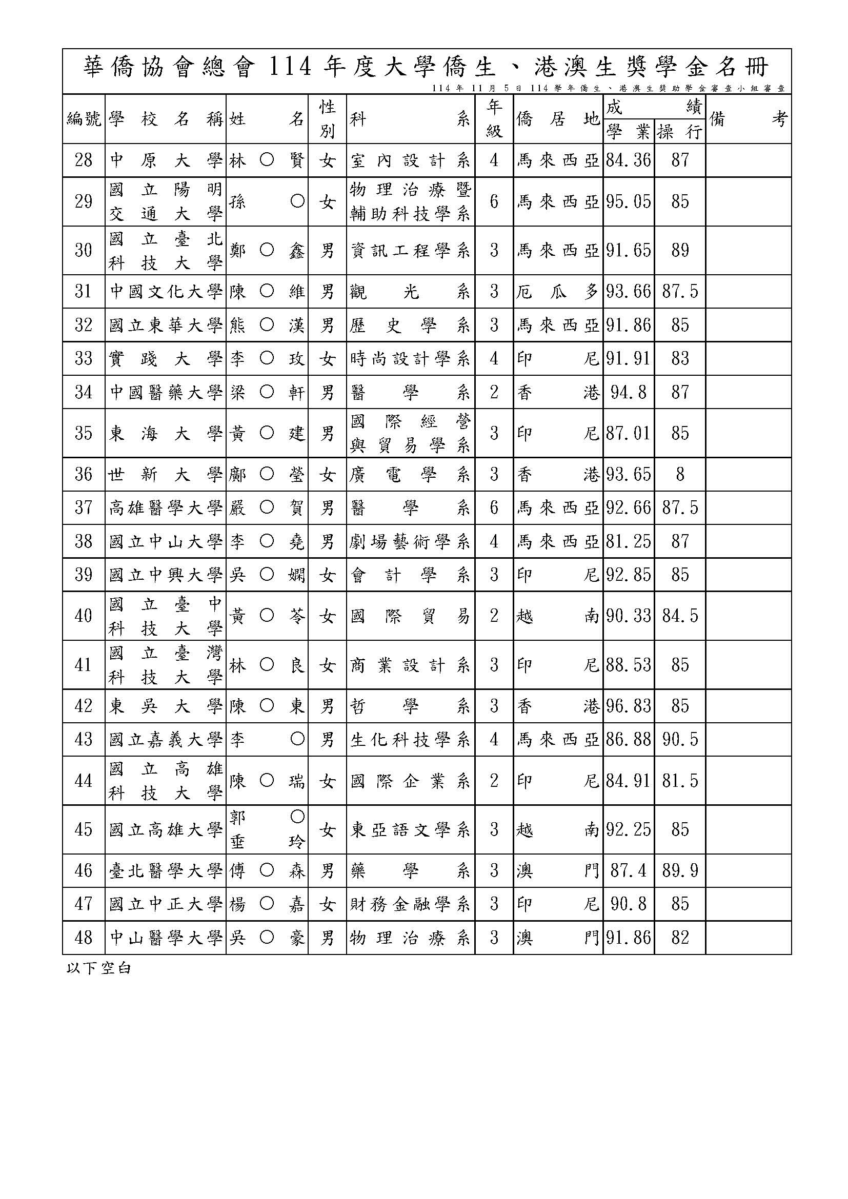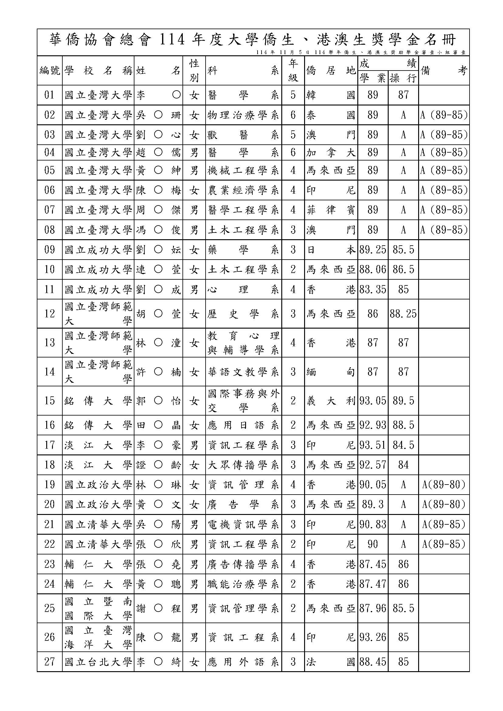114年僑生(港澳生)獎助學金、沈昌煥先生紀念獎學金獲選名單