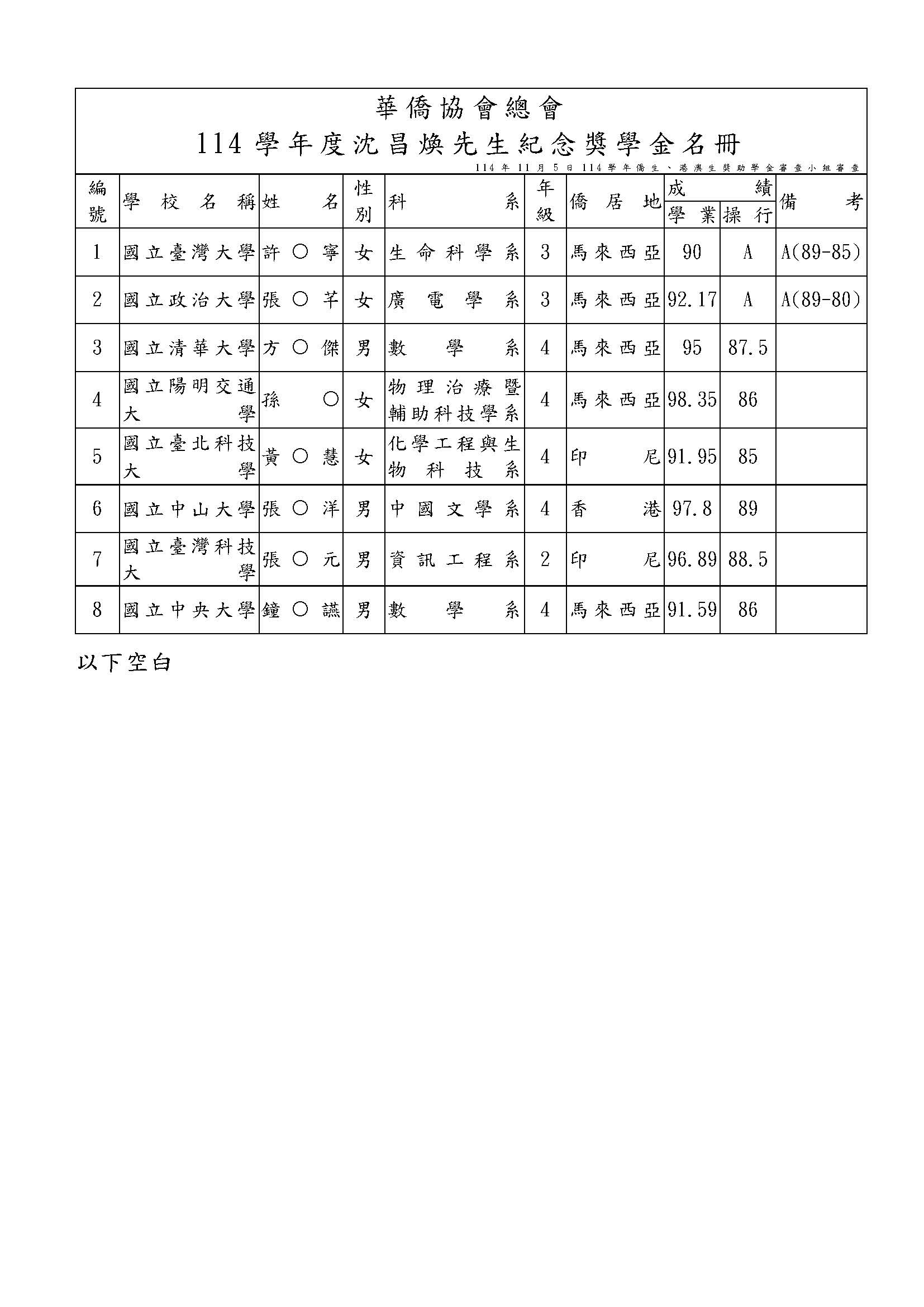 一、依114年11月5日僑生(港澳生)獎助學金、沈昌煥先生紀念獎學金審查小組審議。