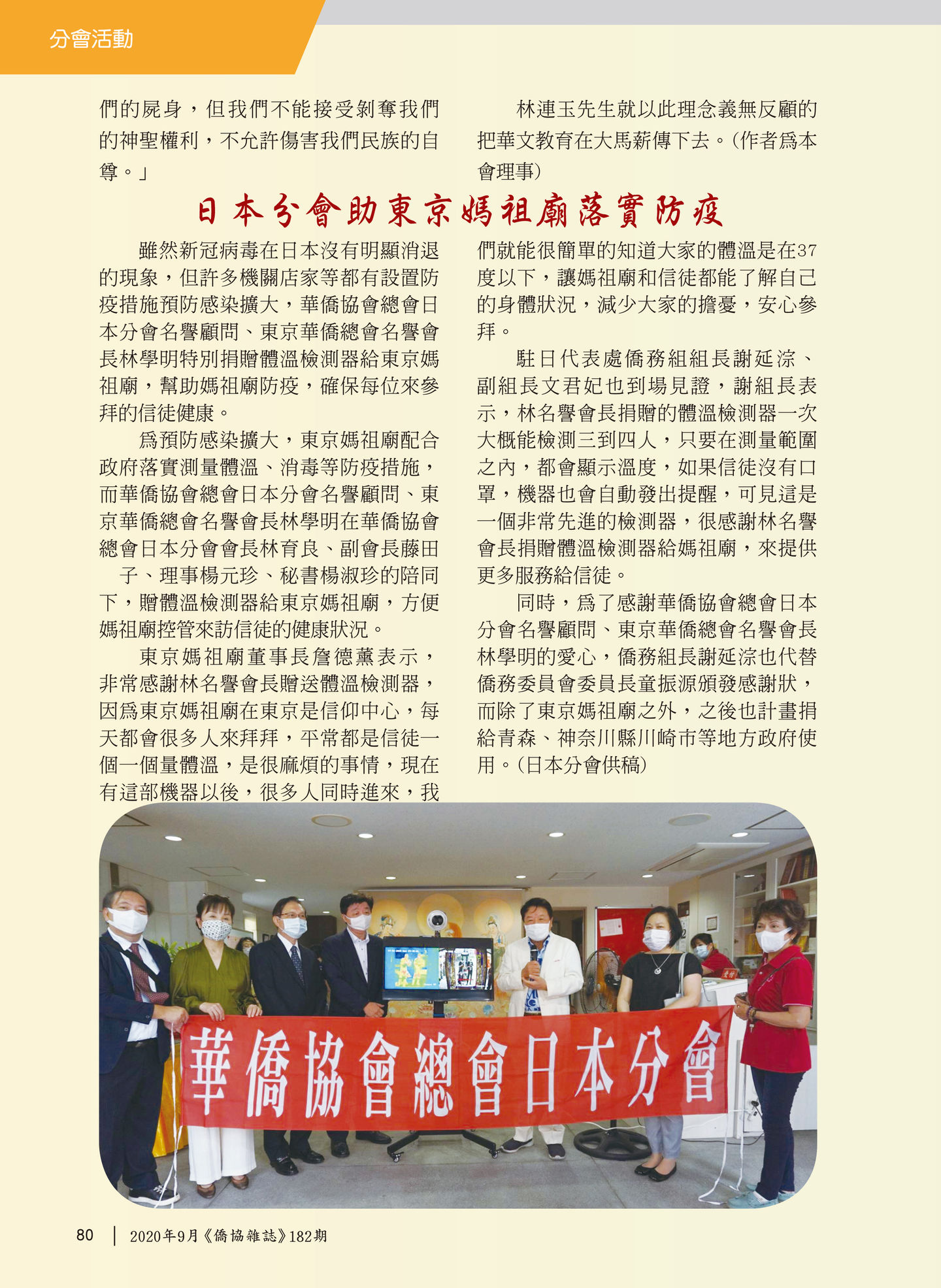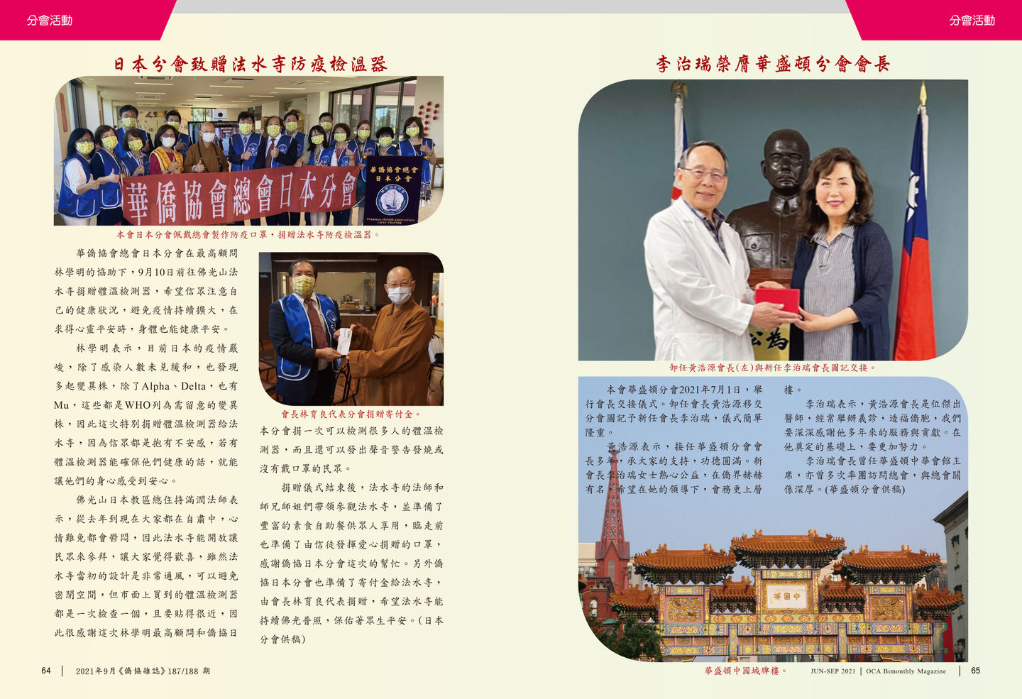 因為日本疫情尚未完全平息,為了確保眾人的健康,華僑協會總會日本分會第三屆會長就任式僅有核心幹部、執行部成員、顧問參加,簡單舉行交接儀式,駐日代表處僑務組組長謝延淙、副組長文君妃也出席見證,並交付僑務委員會委員長童振源的賀狀。