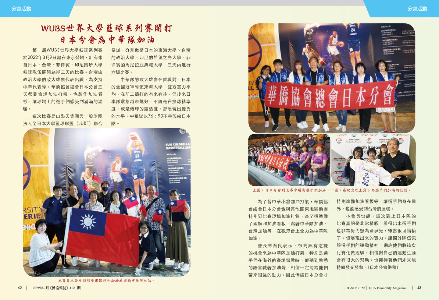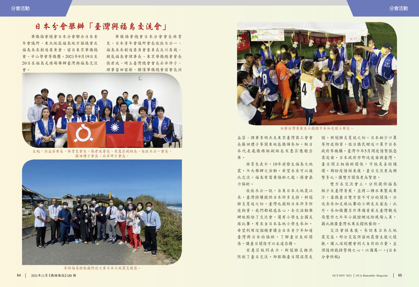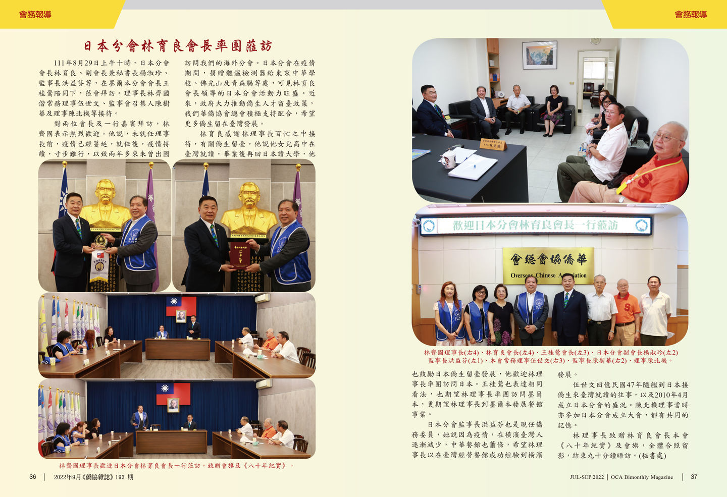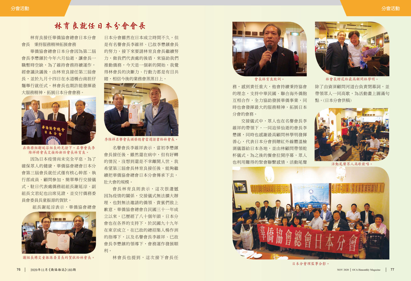 華僑協會總會日本分會因為第二屆會長李懋鑌於今年六月仙逝,讓會長一職暫時空缺,為了維持會務持續運作,經會議決議後,由林育良接任第三屆會長,並於九月十四日在水道橋台南担仔麵舉行就任式,林會長也期許能發揮最大服務精神,拓展日本分會會務。