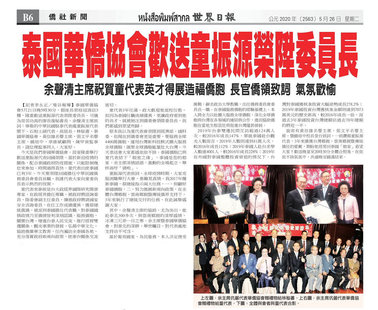 2020年5月21日,本會泰國分會歡送童振源大使並祝榮陛僑委會委員長