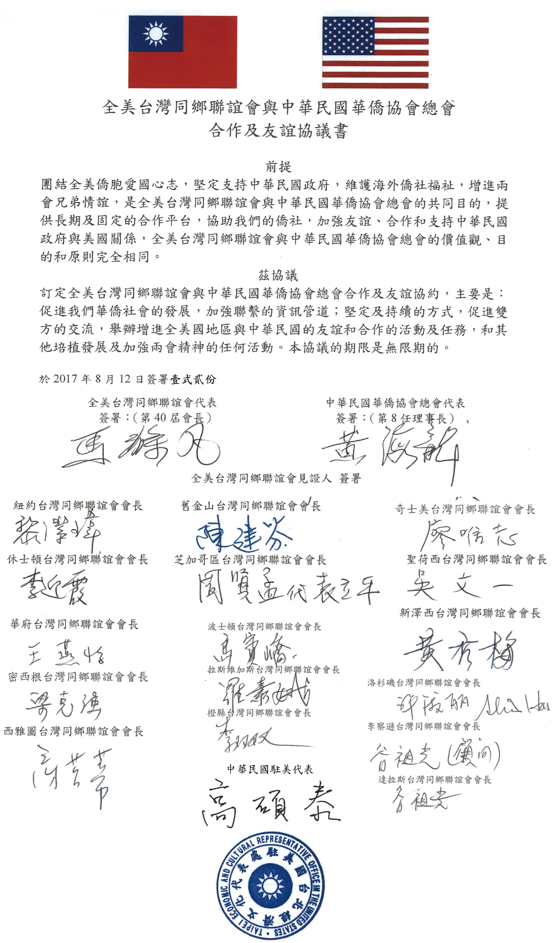 全美台灣同鄉聯誼會與本會簽署合作及友誼協議書
