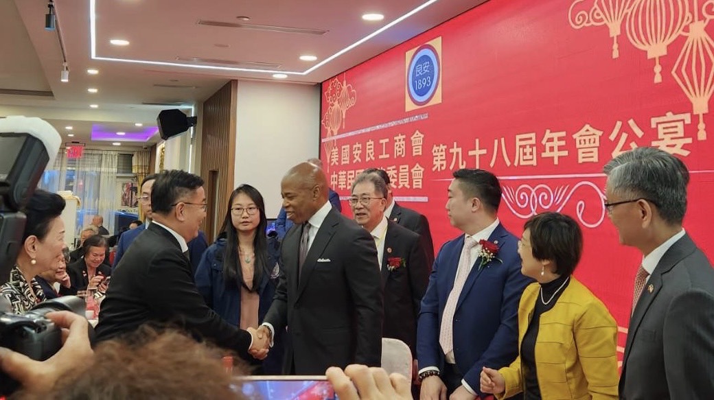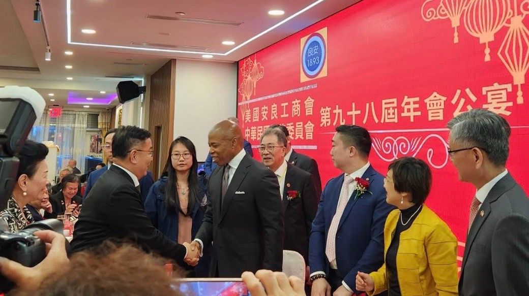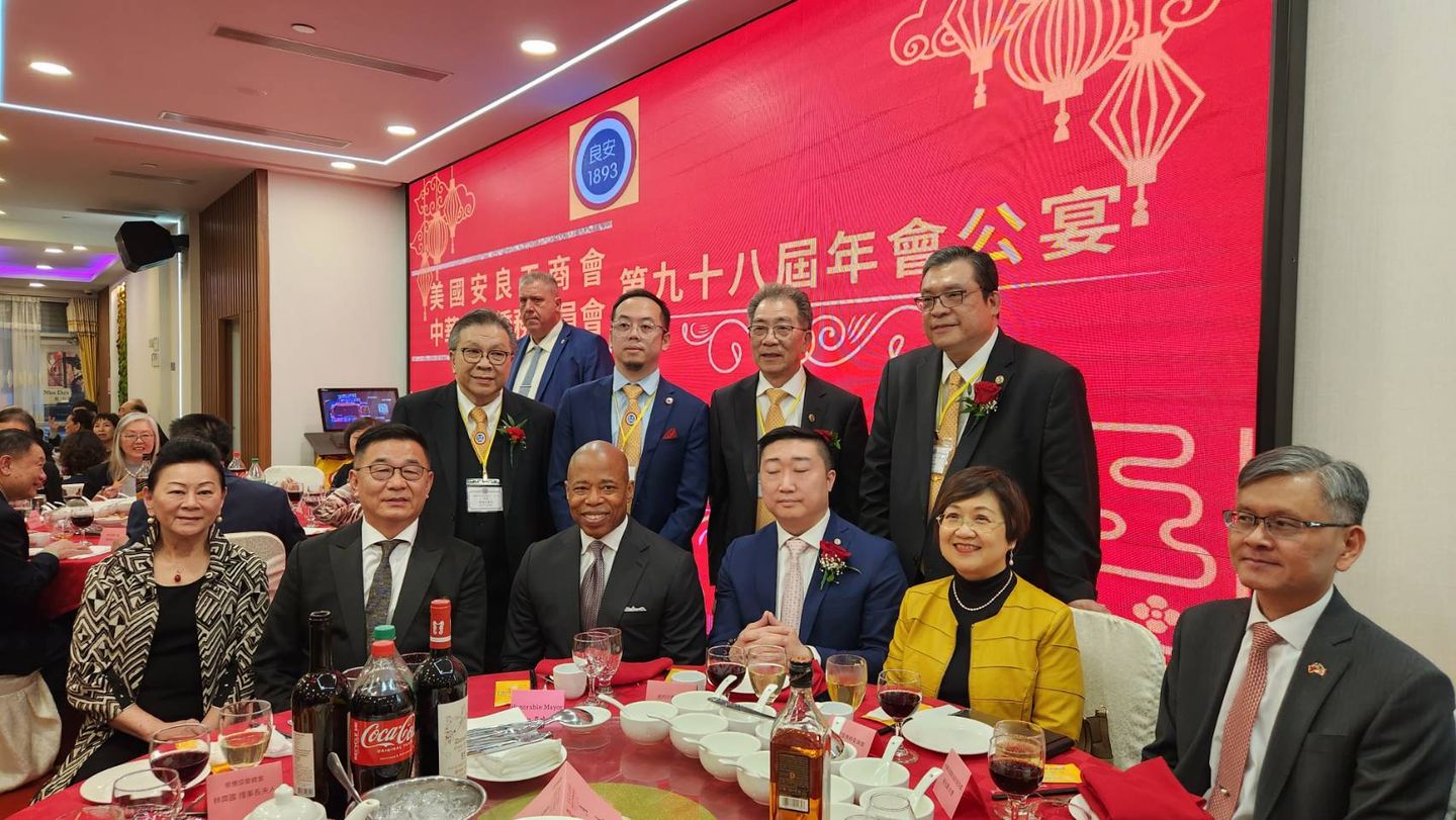 2023年4月17日,紐約市長亞當斯(前排左二)親自出席美國安良工商會年會公宴與嘉賓合影。前排左起:華僑協會總會理事長林齊國伉儷、紐約市長亞當斯、中華公所主席曾偉康、中華民國僑務委員會委員長徐佳青、紐約經文處處長李光章。後排右二為美國安良工商會總理鄧遐勳。