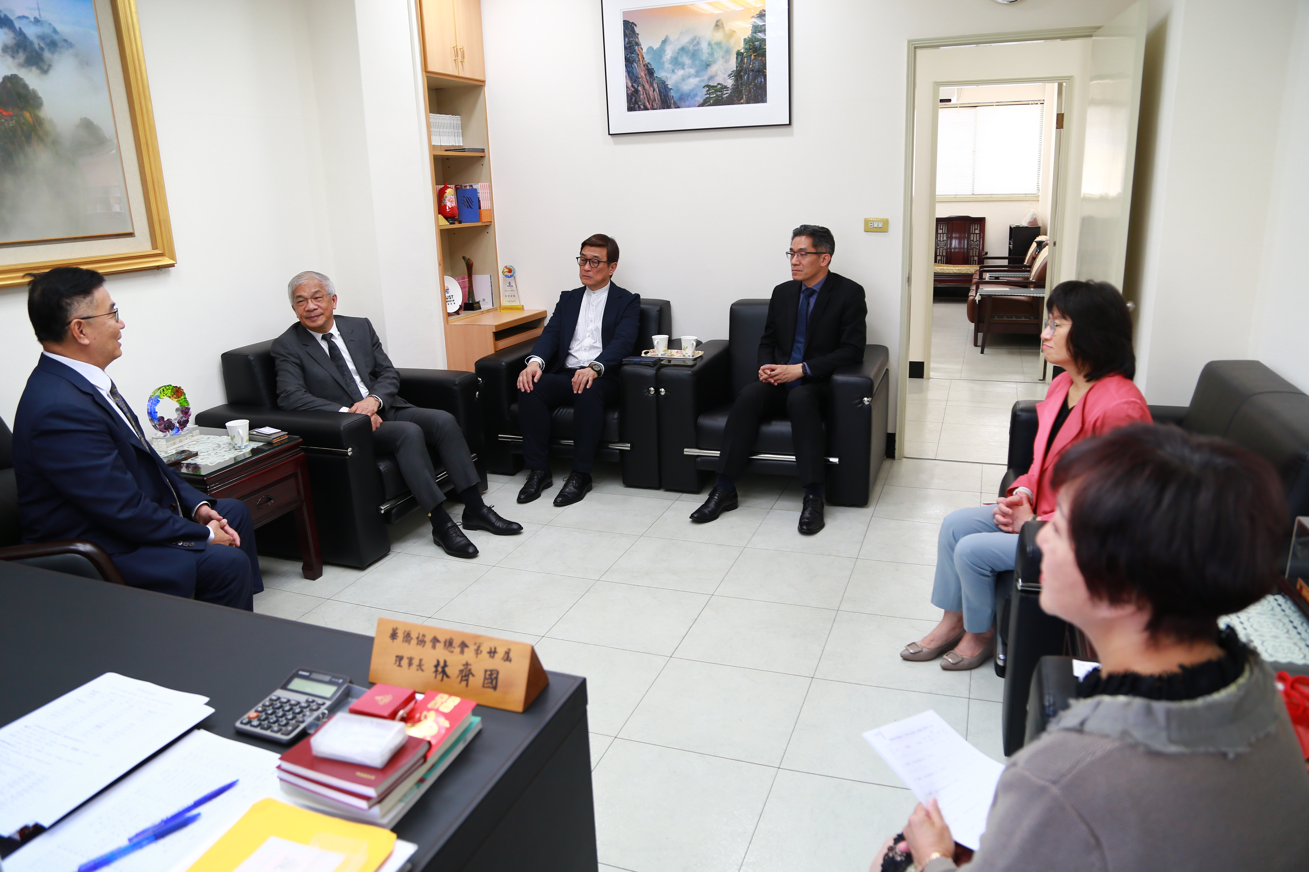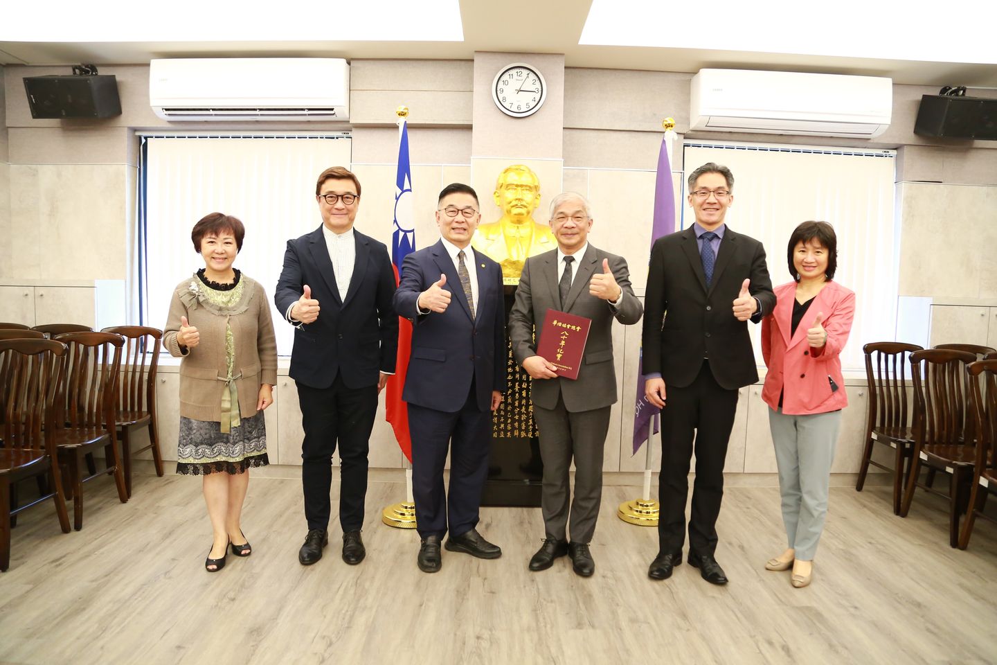 112年11月23日,世新大學陳清河校長率李功勤副校長、賴正能副校長及李慧芳主秘等蒞訪,林齊國理事長偕秘書長蘇靖雯接待。