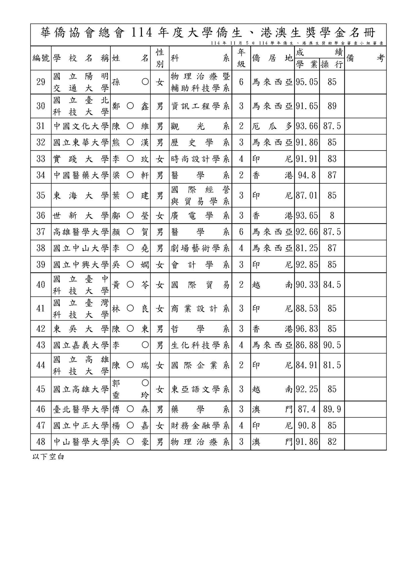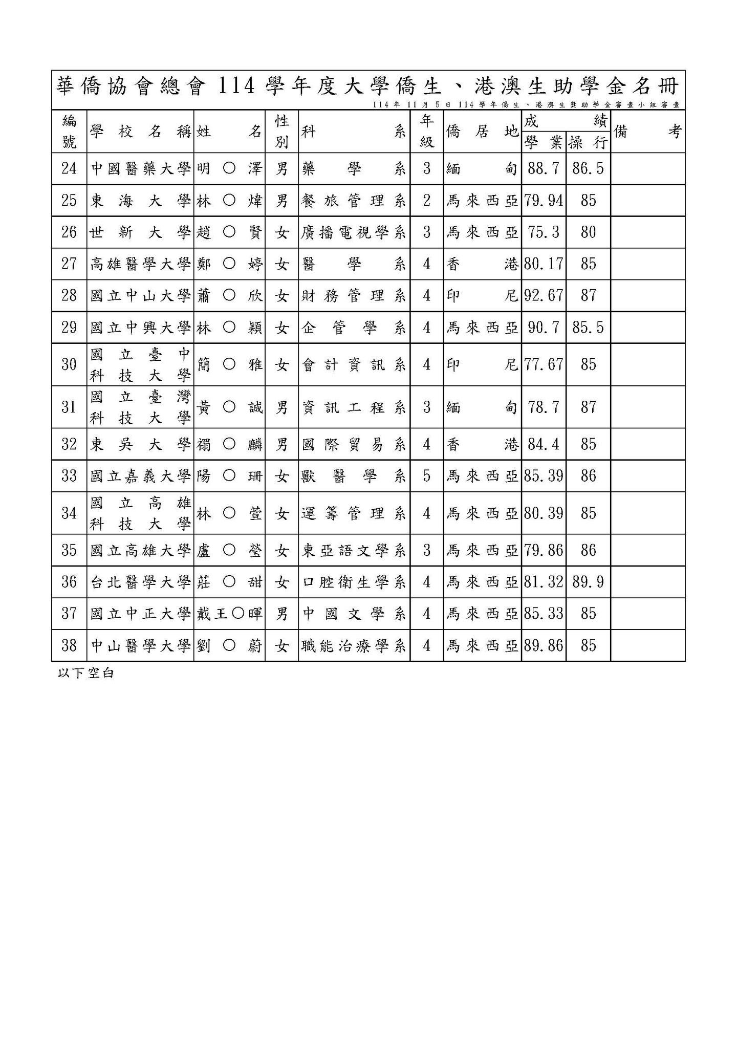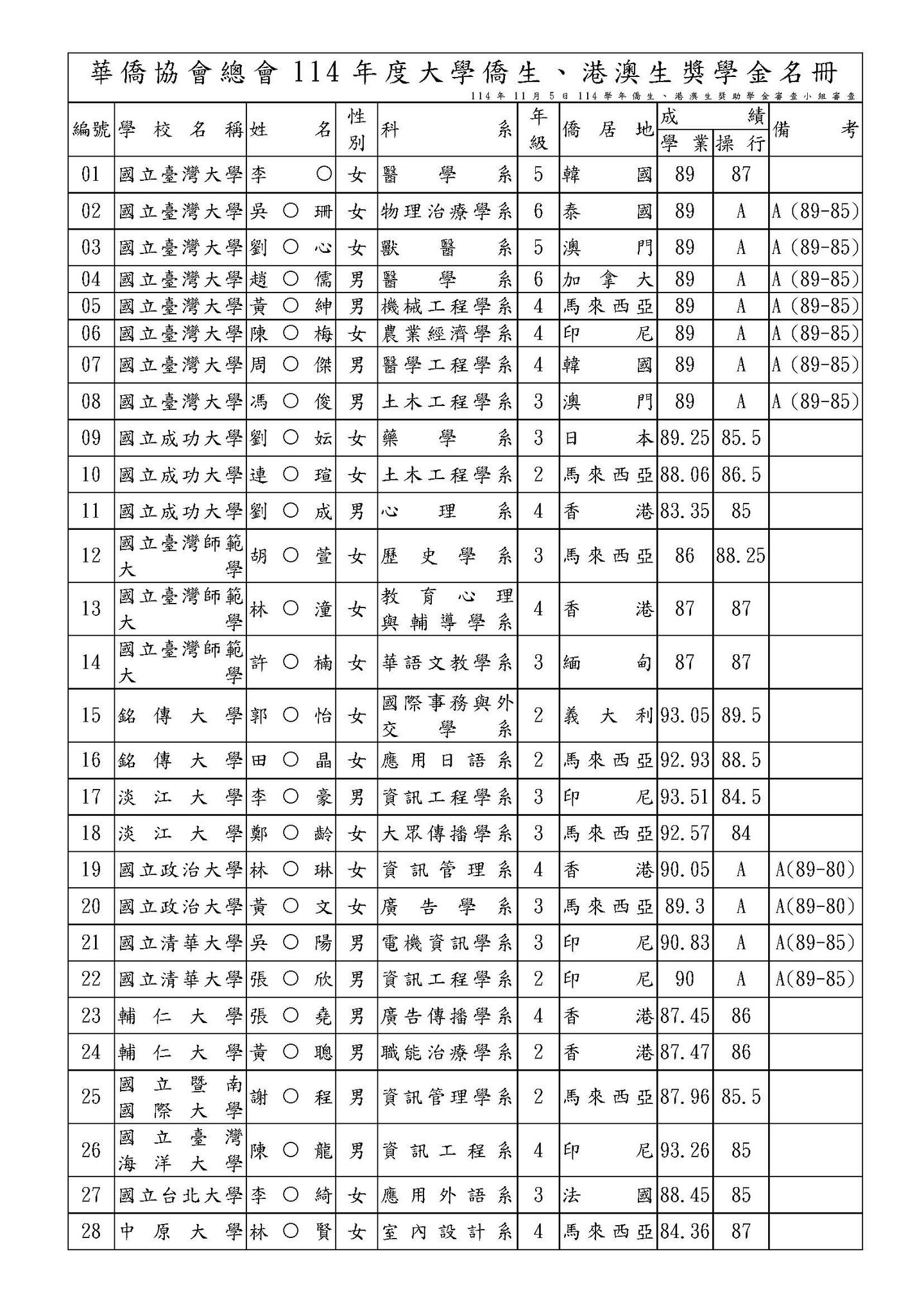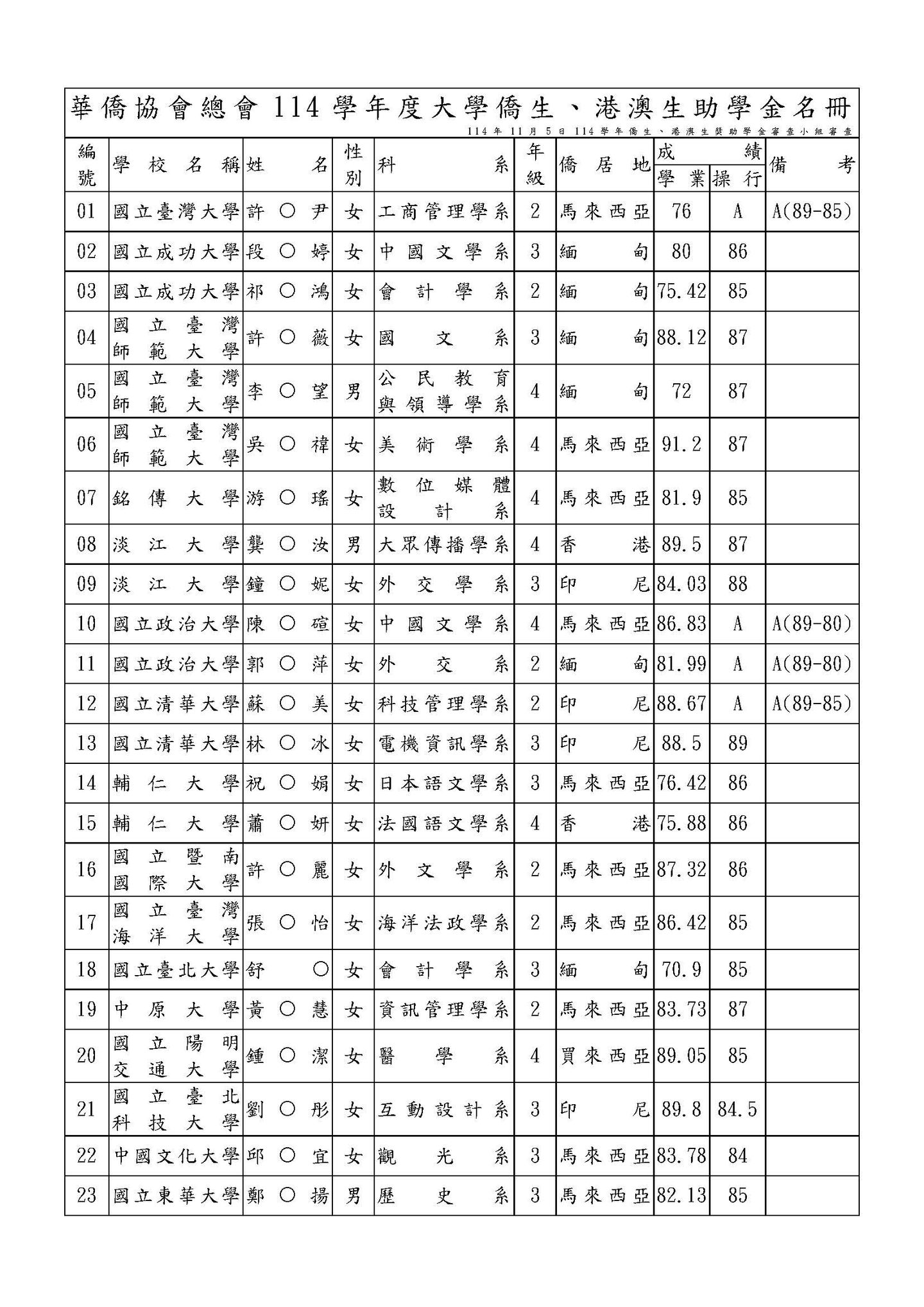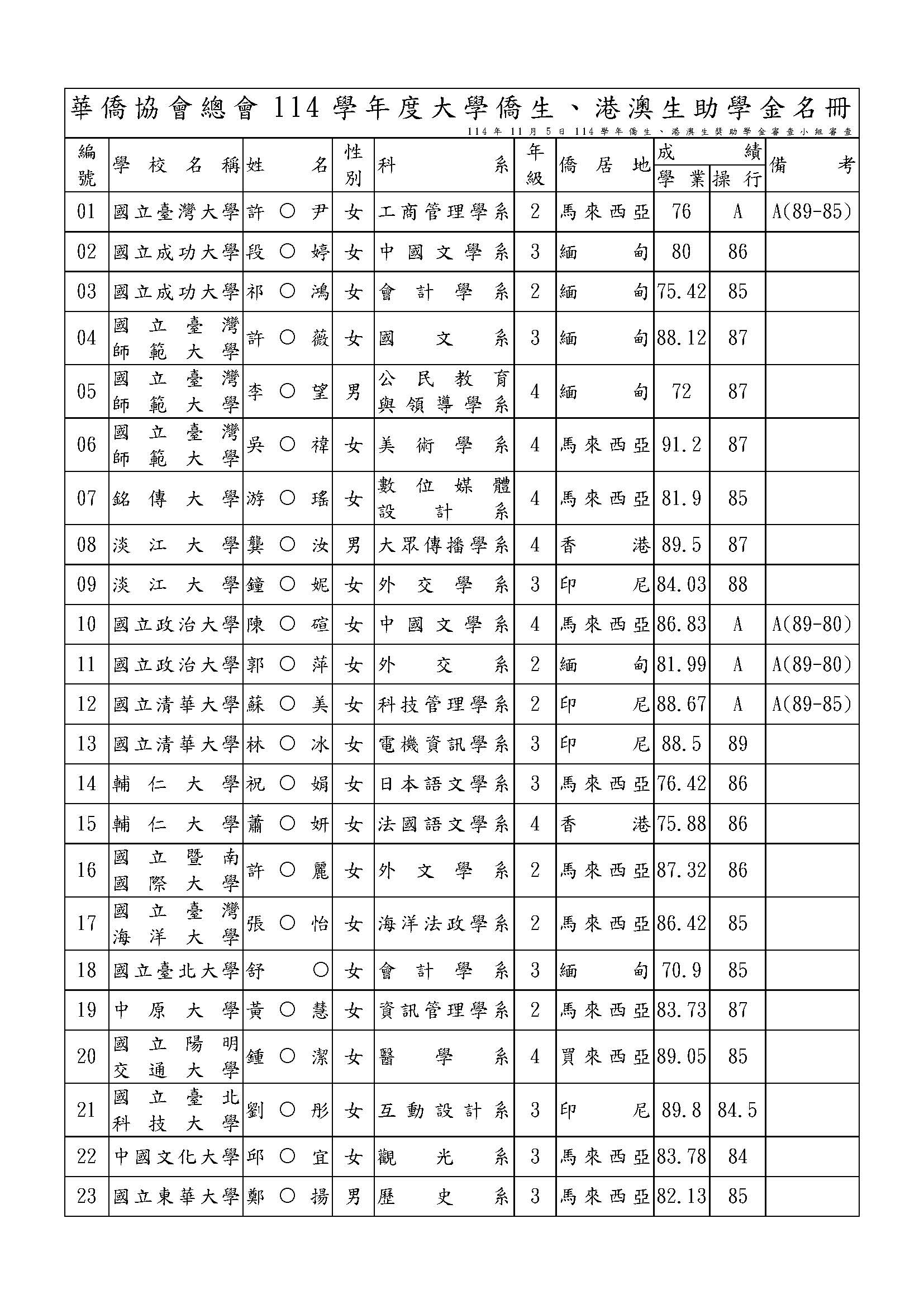 114年僑生(港澳生)獎助學金、沈昌煥先生紀念獎學金獲選名單