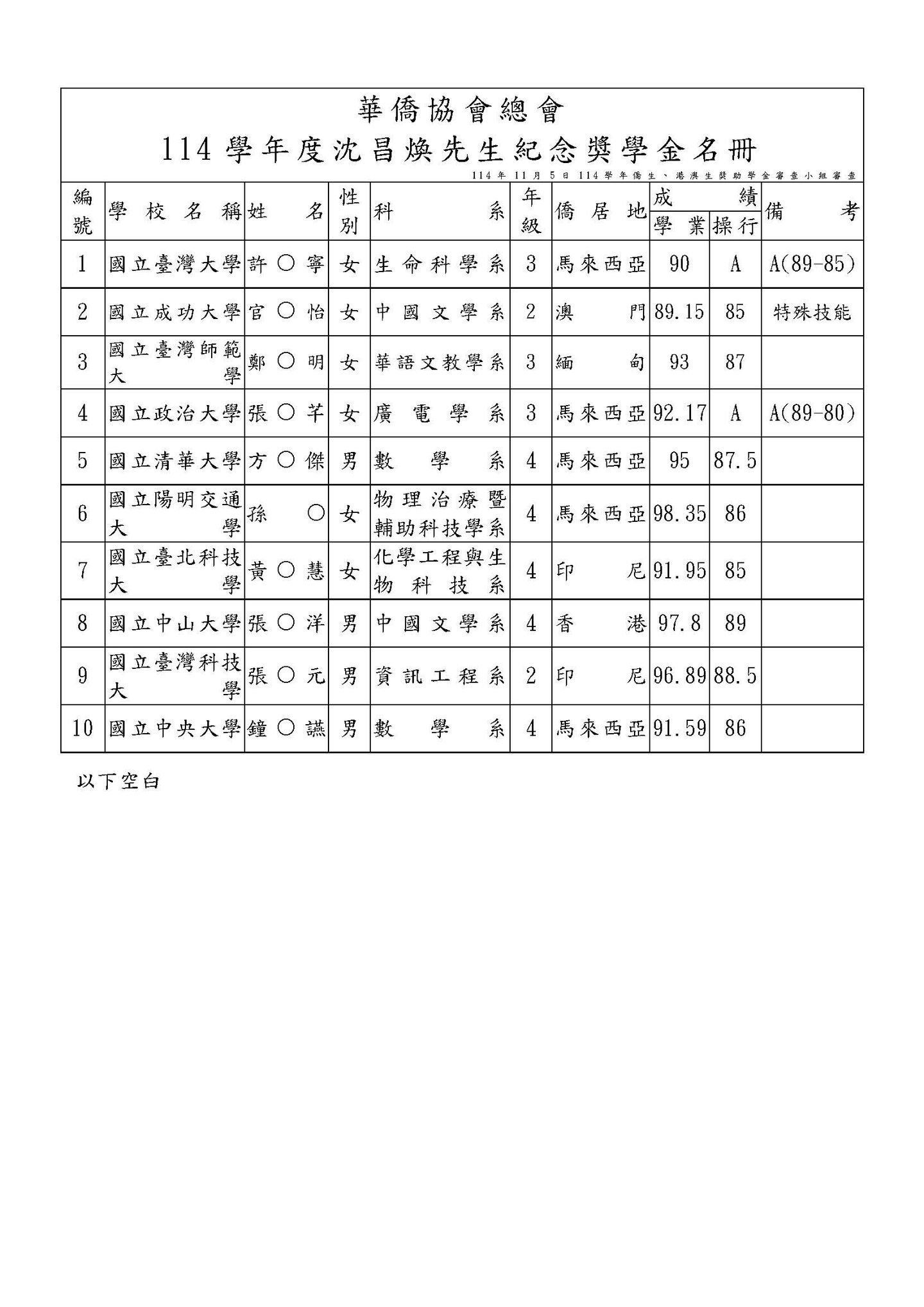一、依114年11月5日僑生(港澳生)獎助學金、沈昌煥先生紀念獎學金審查小組審議。