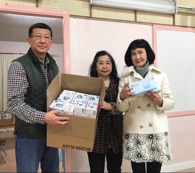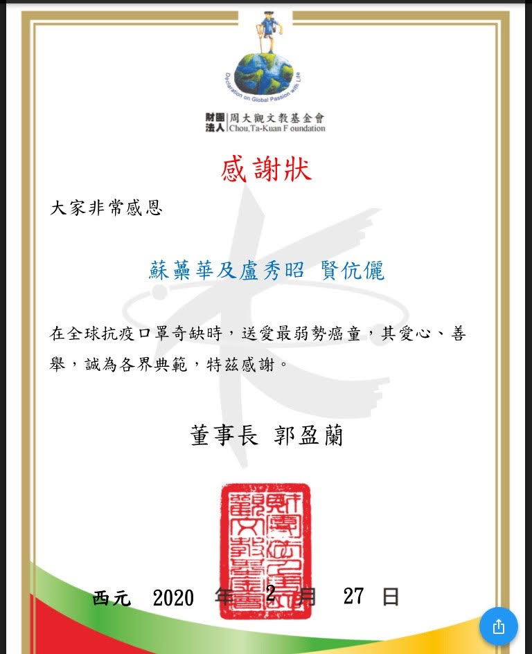 加西分會理事蘇櫐華、盧秀昭夫婦在台灣新冠肺炎疫情擴散時刻,捐贈1000份口罩給「周大觀文教基金會」;幫忙弱勢群體,發揮人飢己飢的精神。相片分別為:1.1000份口罩由會長鄧華一、盧秀昭女士及僑務諮詢委員葉憲年女士點交並封寄台灣2.周大觀文教基金會2020年2月27日感謝函。